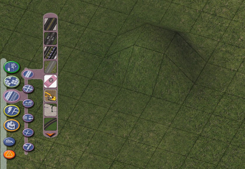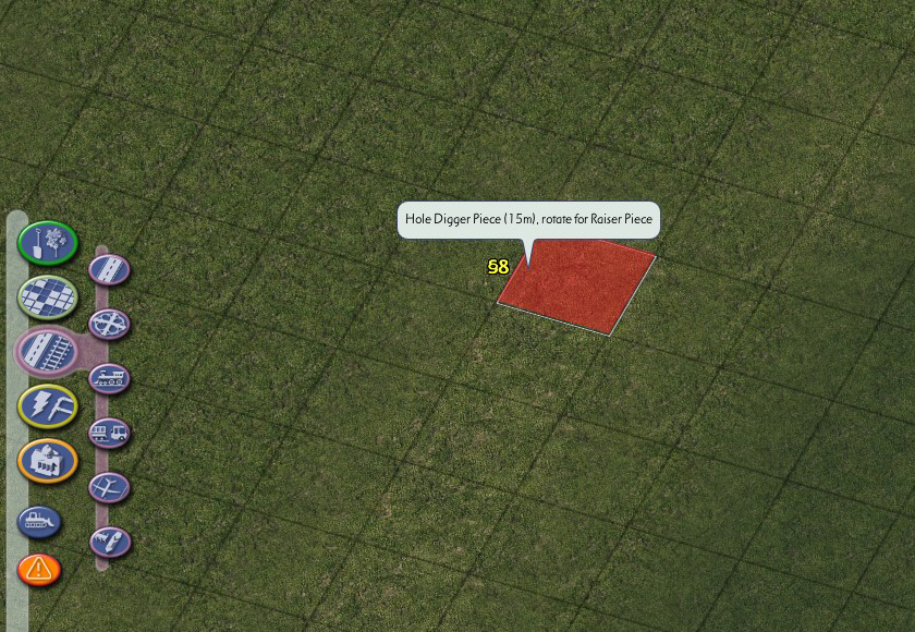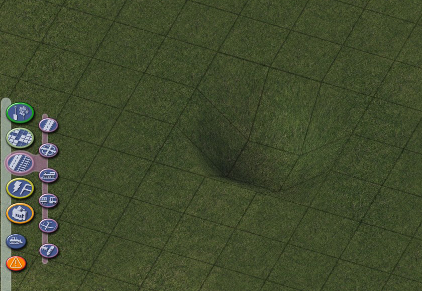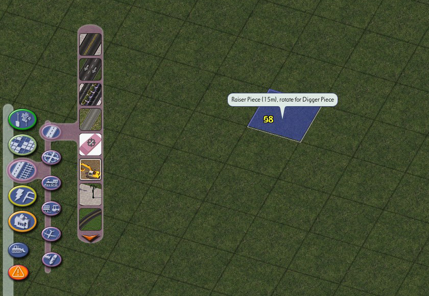 The Hole Diggers and Raisers provided in the NAM are a tool used to raise or lower a single tile of terrain by a precise amount, allowing for fine control over terraforming. This can be particularly useful when dealing with elevated networks (and especially with On-Slope Transitions), and building tunnels and bridges. The Hole Diggers and Raisers can be found near the top of the Highways menu, as well as the the Roads, Rails, and Miscellaneous Transportation menus.